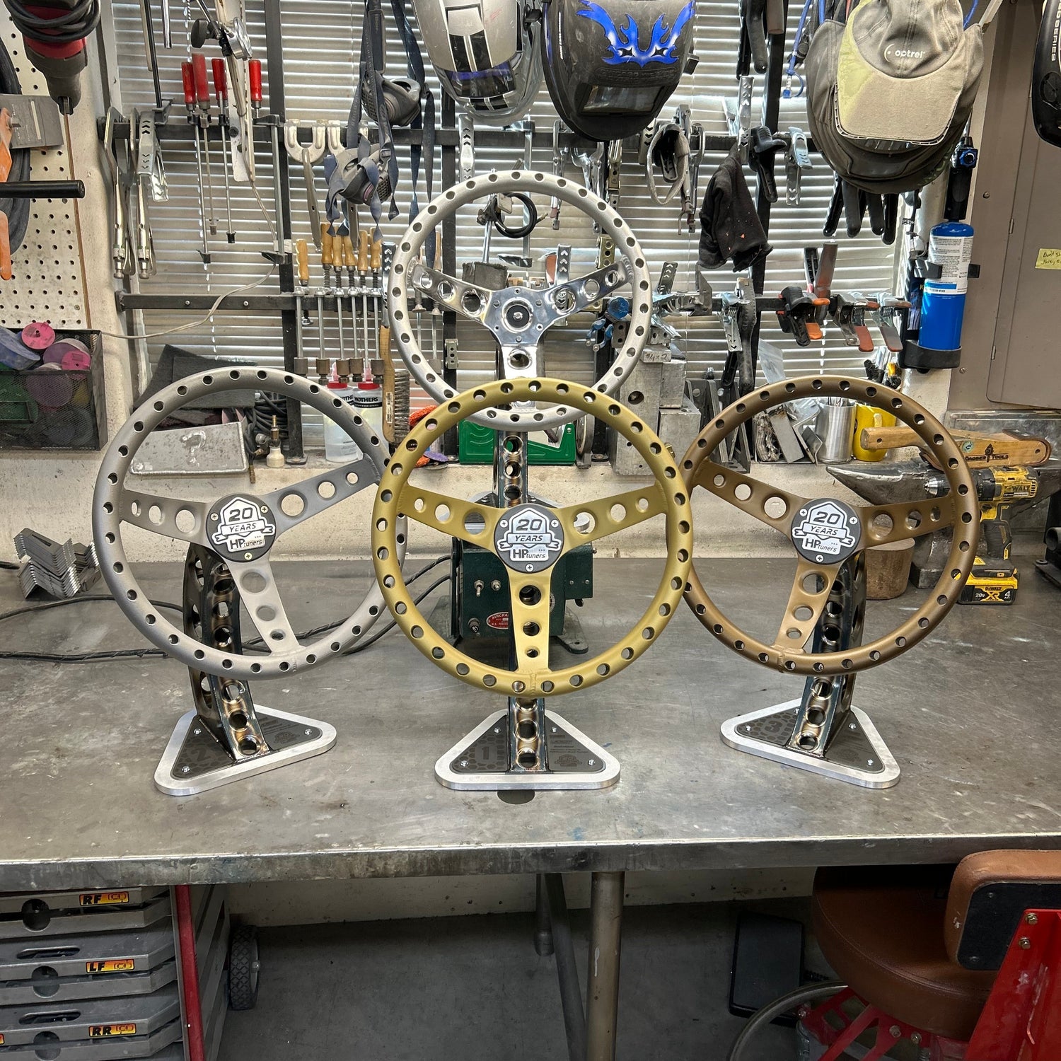A set of three totally custom trophies from the fabricated bases to the fully functional steering wheels complete with 3d printed spinning mechanisms.