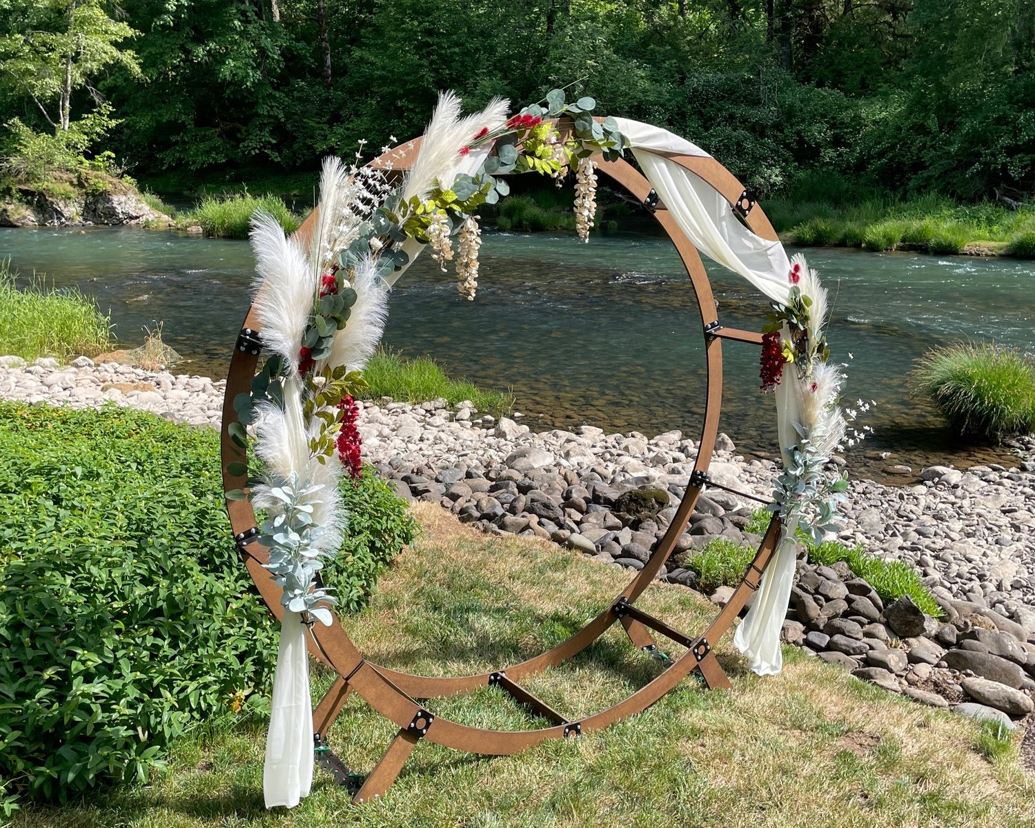 This decorative arch stands at 7' tall and wide but can disassemble into the size of a standard plastic crate for easy storage. Modular construction and standardized hardware ensure assembly and brakedown are a breeze requiring only one person, one drill with phillips #2 bit, and less than 20 minutes with light practice.